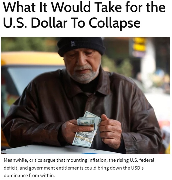 有美國金融新聞網(wǎng)評論稱,不斷加劇的通貨膨脹、不斷上升的美國聯(lián)邦赤字和政府福利可能會(huì)從內(nèi)部削弱美元在全球金融體系的主導(dǎo)地位。