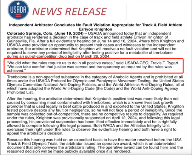 這屆奧運(yùn)會(huì),享受了美國(guó)這項(xiàng)“服務(wù)”的除了花游運(yùn)動(dòng)員卡莉斯塔,還有田徑運(yùn)動(dòng)員埃里揚(yáng)·奈頓。他們分別在5月和3月藥檢陽(yáng)性,但巧的是,美國(guó)官方對(duì)這兩人的脫罪聲明都是卡在奧運(yùn)會(huì)前發(fā)出,“及時(shí)”地保住了他們的參賽資格,然后美國(guó)反興奮劑機(jī)構(gòu)官網(wǎng)又“及時(shí)”地把聲明刪掉了。