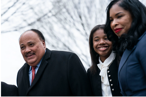 2022年4月4日,馬丁·路德·金三世,妻子安德莉亞·沃特斯·金和女兒約蘭達·蕾妮·金抵達華盛頓特區(qū)的馬丁·路德·金紀念館守夜