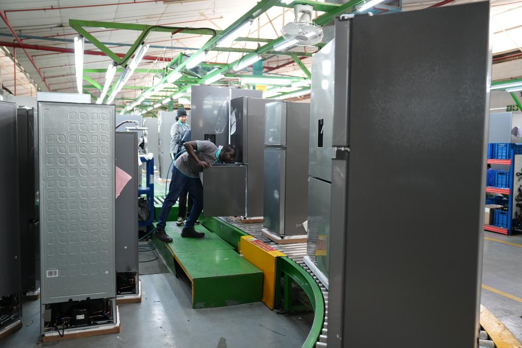 8月14日,在南非開普敦,當(dāng)?shù)貑T工在海信南非工業(yè)園的冰箱生產(chǎn)線上工作。新華社記者王雷攝