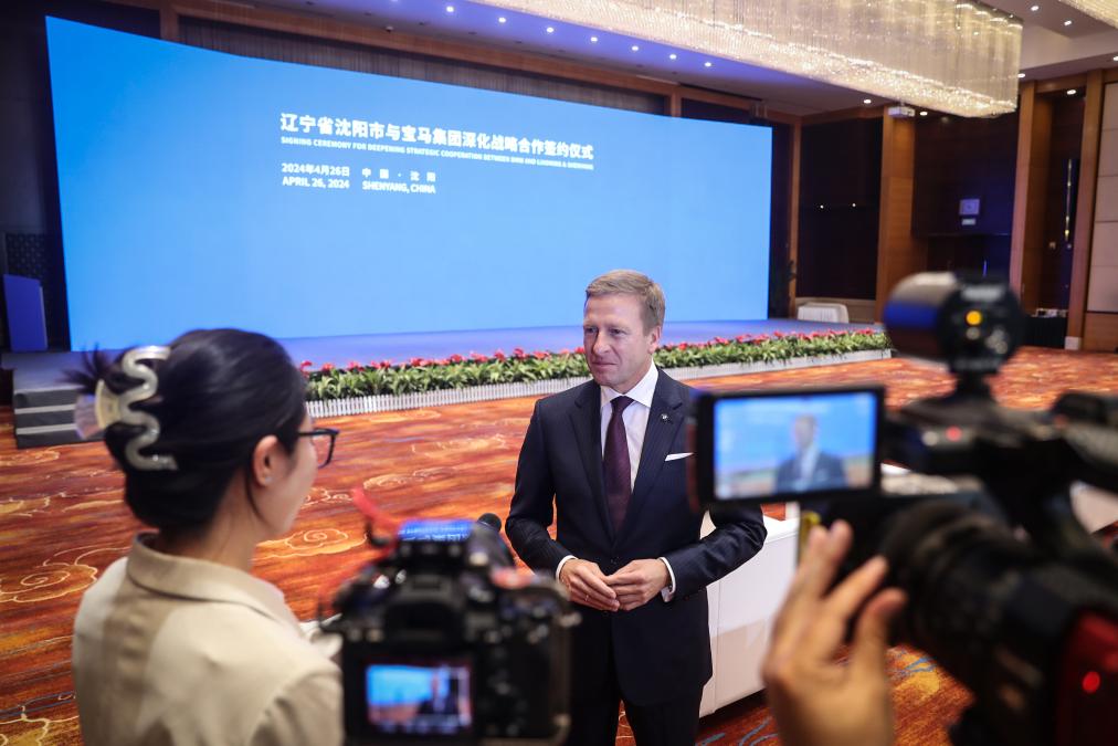 2024年4月26日,寶馬集團(tuán)董事長齊普策在遼寧省沈陽市與寶馬集團(tuán)深化戰(zhàn)略合作簽約儀式現(xiàn)場接受采訪。新華社記者潘昱龍攝