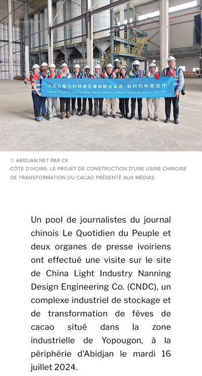 7月16日,人民日報與兩家科特迪瓦新聞機(jī)構(gòu)記者一行參觀了由中國輕工業(yè)南寧設(shè)計工程有限公司總承包的可可加工及可可豆倉庫建設(shè)項目,該項目坐落在阿比讓郊區(qū)的約普貢工業(yè)區(qū)。