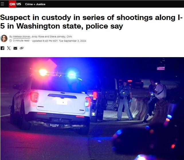 據(jù)美國(guó)有線電視新聞網(wǎng)(CNN)3日?qǐng)?bào)道,美國(guó)官員們稱(chēng),華盛頓州西雅圖和塔科馬市5號(hào)州際公路部分路段發(fā)生一系列槍擊事件,造成6人受傷,嫌疑人已被拘捕。