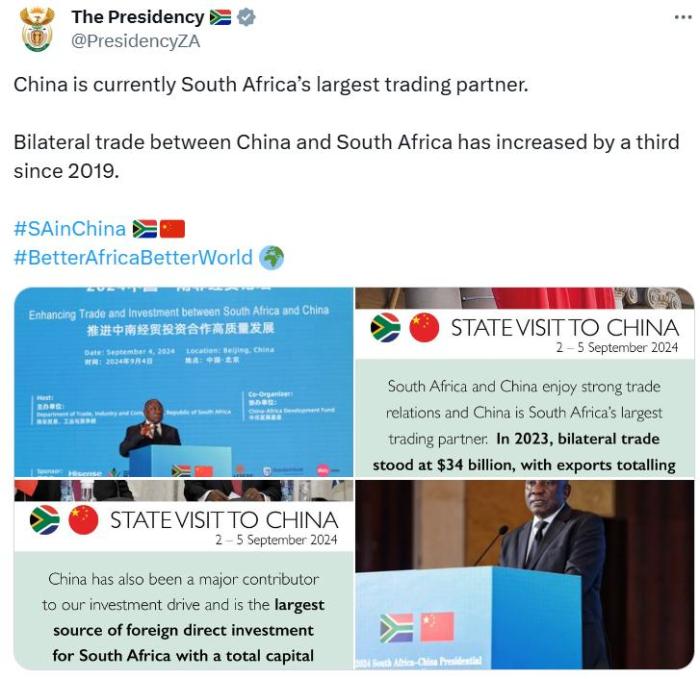 南非總統(tǒng)官方賬號也在峰會(huì)期間發(fā)文稱,中國目前是南非最大的貿(mào)易伙伴,南非和中國擁有充滿活力、多元和不斷增長的經(jīng)濟(jì),能夠?yàn)橄M_拓新市場的企業(yè)提供豐富機(jī)遇。