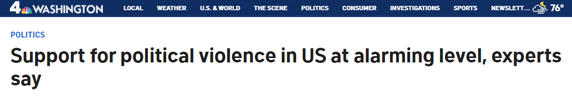 另外,美國國家廣播公司華盛頓地方頻道(NBC Washington)日前報(bào)道稱,盡管美國支持政治暴力的人與去年相比略有減少,但暴力支持者現(xiàn)在更傾向使用槍支來實(shí)現(xiàn)他們的目的。數(shù)月來,專家們始終表示,美國對(duì)出于政治動(dòng)機(jī)的暴力的支持度達(dá)到了令人十分擔(dān)憂的水平。