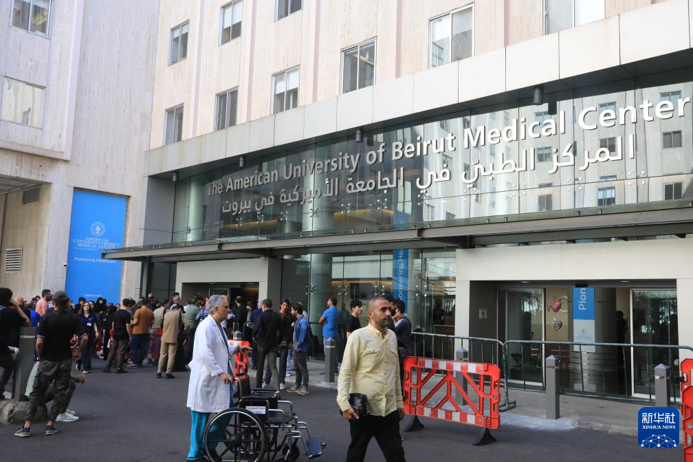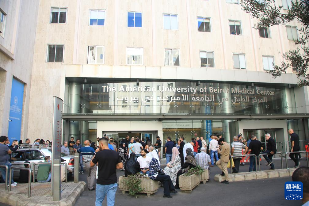 9月20日,在黎巴嫩首都貝魯特,人們聚集在貝魯特美國大學醫(yī)療中心門口。新華社記者 程帥朋 攝