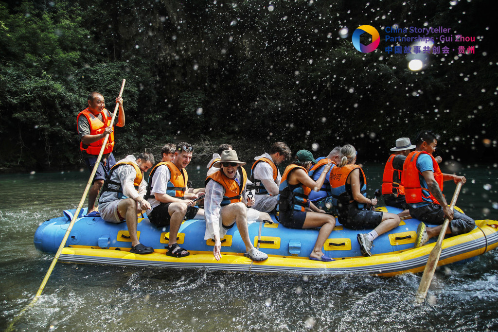 采訪團(tuán)外籍成員在興義市馬嶺河峽谷體驗(yàn)漂流戲水,享受清涼時(shí)光。