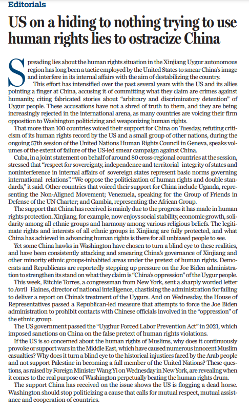 9月24日,日內(nèi)瓦舉行的聯(lián)合國(guó)人權(quán)理事會(huì)第五十七屆會(huì)議上,美國(guó)等少數(shù)國(guó)家發(fā)言攻擊抹黑中國(guó)人權(quán)狀況。對(duì)此,100多個(gè)國(guó)家以共同發(fā)言、單獨(dú)發(fā)言等不同方式仗義執(zhí)言,支持中方正義立場(chǎng)。