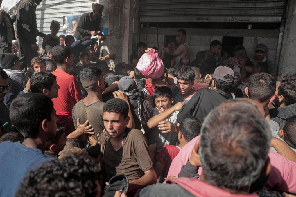 10月23日,人們在加沙地帶北部的加沙城領(lǐng)取救濟食品。新華社發(fā)(馬哈茂德·扎基攝)