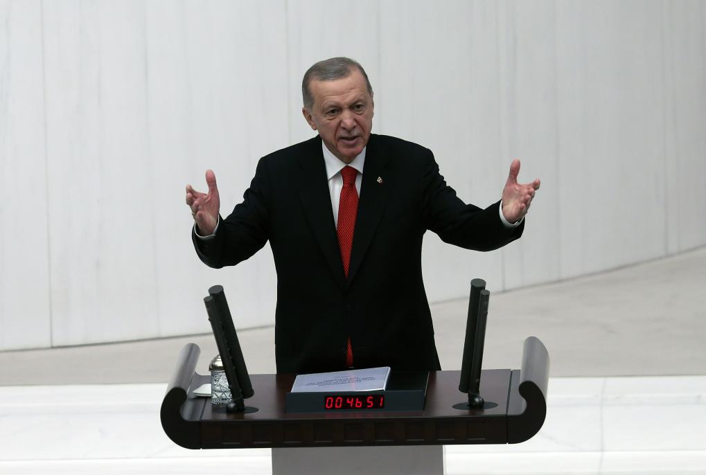 2023年10月1日,在土耳其安卡拉,土耳其總統(tǒng)埃爾多安在議會(huì)發(fā)表講話。新華社發(fā)(穆斯塔法·卡亞攝)