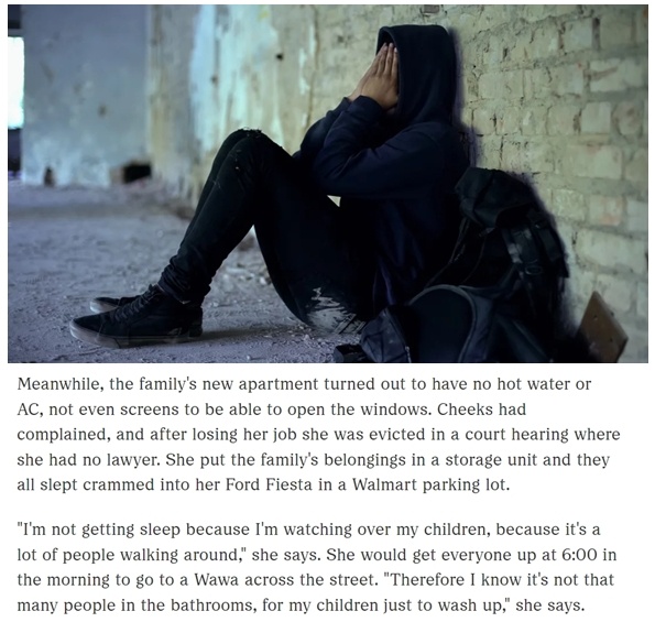 在弗吉尼亞州生活的奇克斯是一位獨(dú)自撫養(yǎng)四個(gè)孩子的母親。由于失業(yè)后無(wú)力負(fù)擔(dān)房租,她和四個(gè)孩子的臨時(shí)住房是一輛小轎車,這輛車長(zhǎng)期停在一家超市的停車場(chǎng)里。