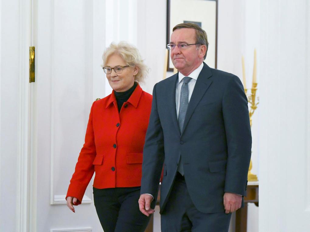 2023年1月19日,在德國柏林的總統(tǒng)府,皮斯托里烏斯(右)步入儀式現(xiàn)場。德國總統(tǒng)施泰因邁爾當(dāng)日向鮑里斯·皮斯托里烏斯頒發(fā)任命書,正式任命其為國防部長。新華社記者任鵬飛攝