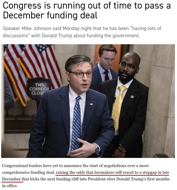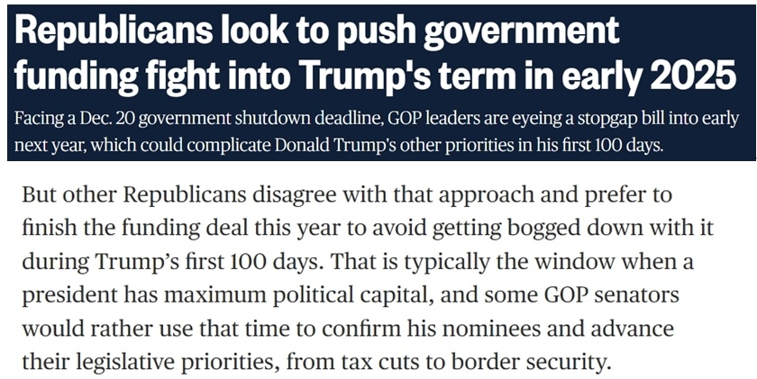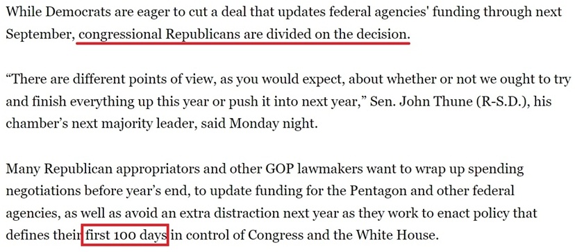據(jù)報道,不少共和黨議員、特別是負責撥款的議員希望在年底前完成新財年的總預算支出談判,避免給特朗普的新政府明年上任后制定政策時帶來額外干擾,因為這些政策將“決定他們控制國會和白宮的頭100天”。