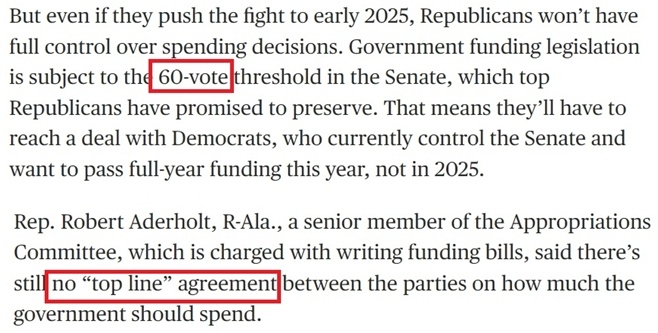 有分析指出,涉及為政府撥款的立法必須在參議院獲得至少60票的支持,而民主黨目前仍控制著參議院,這意味著共和黨仍必須與民主黨取得共識。