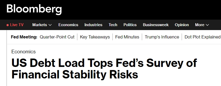 彭博社(Bloomberg)在報(bào)道中提到,美國(guó)政府的債務(wù)負(fù)擔(dān)現(xiàn)在被認(rèn)為是金融穩(wěn)定面臨的最大風(fēng)險(xiǎn),在美聯(lián)儲(chǔ)的一項(xiàng)調(diào)查中,其重要性超過了持續(xù)的通貨膨脹。逾半數(shù)受訪者(54%)認(rèn)為美國(guó)財(cái)政債務(wù)的可持續(xù)性是一個(gè)突出風(fēng)險(xiǎn),而半年前這一比例僅為40%。美聯(lián)儲(chǔ)的半年度金融穩(wěn)定報(bào)告寫道:“美國(guó)財(cái)政債務(wù)可持續(xù)性方面的擔(dān)憂位居榜首,其次是中東緊張局勢(shì)升級(jí)和政策的不確定性。”