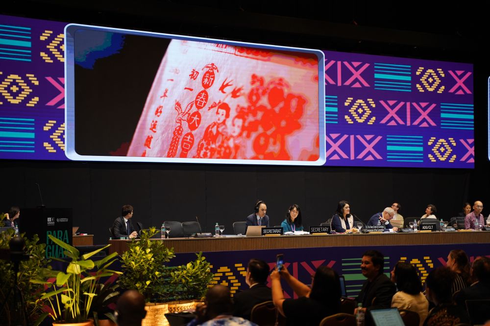 12月4日,在巴拉圭亞松森聯(lián)合國教科文組織保護(hù)非物質(zhì)文化遺產(chǎn)政府間委員會(huì)第19屆常會(huì)評(píng)審現(xiàn)場(chǎng),大屏幕播放春節(jié)宣傳視頻。新華社記者朱雨博攝