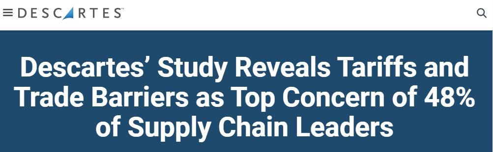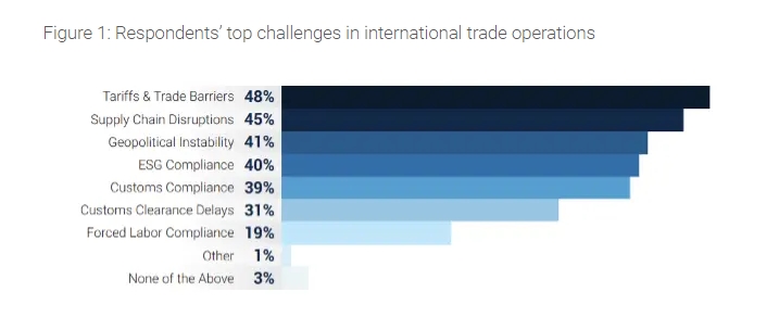 調(diào)查顯示,48%的受訪者認(rèn)為關(guān)稅和貿(mào)易壁壘上升是他們最擔(dān)心的問題,緊隨其后的是供應(yīng)鏈中斷(45%)和地緣政治不穩(wěn)定(41%)。此外,無論所在公司規(guī)模大小,受訪者都將關(guān)稅和貿(mào)易壁壘列為當(dāng)前面臨的首要問題。這項報告共調(diào)查了978名來自歐洲、北美、南美和亞太地區(qū)主要貿(mào)易國的供應(yīng)鏈領(lǐng)域領(lǐng)導(dǎo)者。