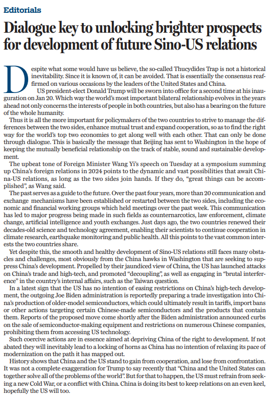 因此,雙方應(yīng)當(dāng)努力管控分歧、增信釋疑、拓展合作,為世界前兩大經(jīng)濟體開辟友好相處、共同發(fā)展的道路。這只能通過對話溝通來實現(xiàn)。