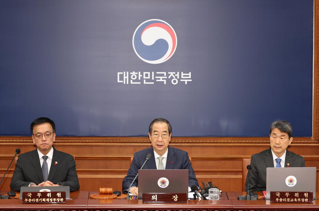 12月14日,在韓國首都首爾,代行總統(tǒng)職權的韓國國務總理韓德洙(中)召開臨時國務會議。新華社/紐西斯通訊社