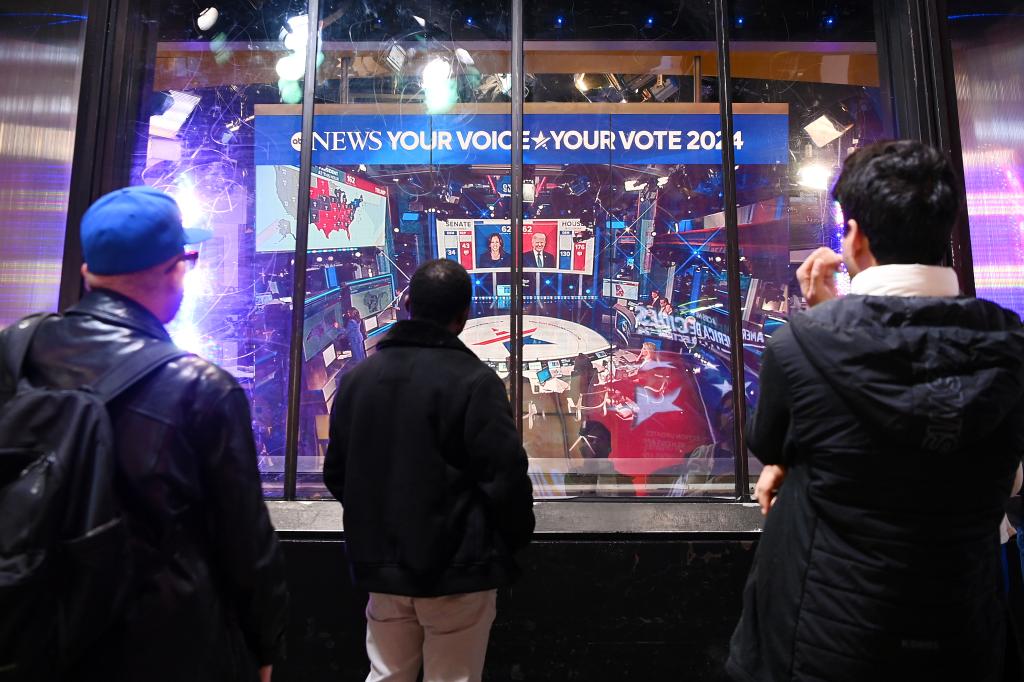 2024年11月5日,人們?cè)诿绹?guó)紐約時(shí)報(bào)廣場(chǎng)觀看美國(guó)總統(tǒng)選舉實(shí)時(shí)出口民調(diào)。新華社記者 李睿 攝