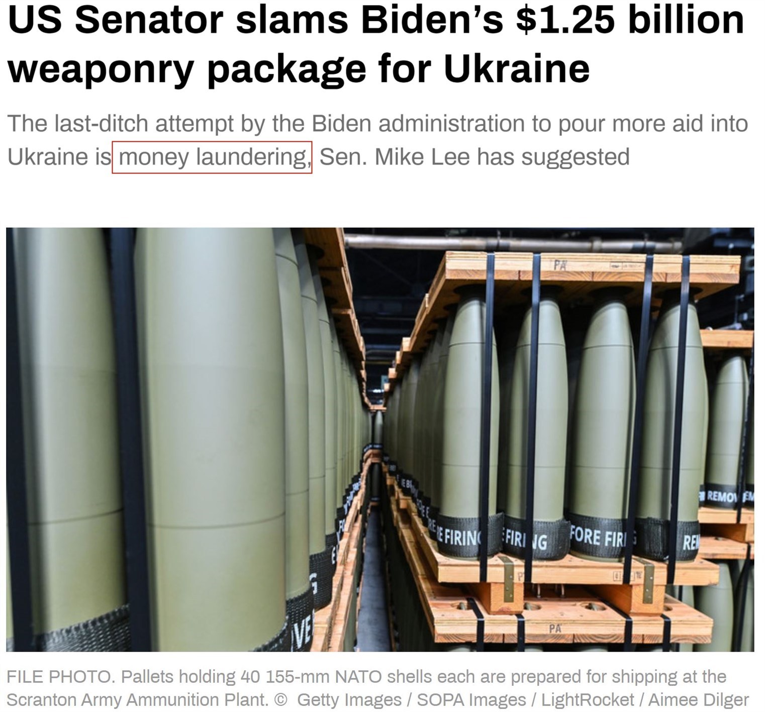 “今日俄羅斯”電視臺報道稱,參議員邁克·李認為,拜登政府向烏克蘭提供新的“豪華武器包”的提議是“洗錢”行為。