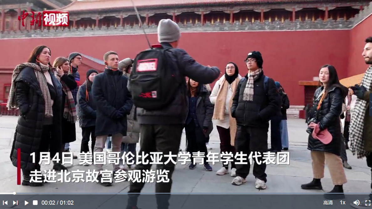 1月4日,美國哥倫比亞大學青年學生代表團走進北京故宮參觀游覽,感受中國古代皇家宮殿建筑群的魅力。2025年新年伊始,美國哥倫比亞大學青年學生代表團于元旦當天抵達北京。他們將在中國停留10天,相繼訪問北京、西安和上海等多個城市。代表團由哥倫比亞大學國際事務和公共管理專業(yè)的27名碩士研究生組成,他們分別來自全球17個國家。該代表團在北京體驗傳統(tǒng)的“三件套”——長城、故宮和烤鴨。西安和上海也為他們量身定制了參訪行程。青年學生們期待著通過這次訪華加深對中國各地的了解,與中國青年交流互動,成為好伙伴、好朋友。(記者 卞正鋒 制作 王佳琪)
