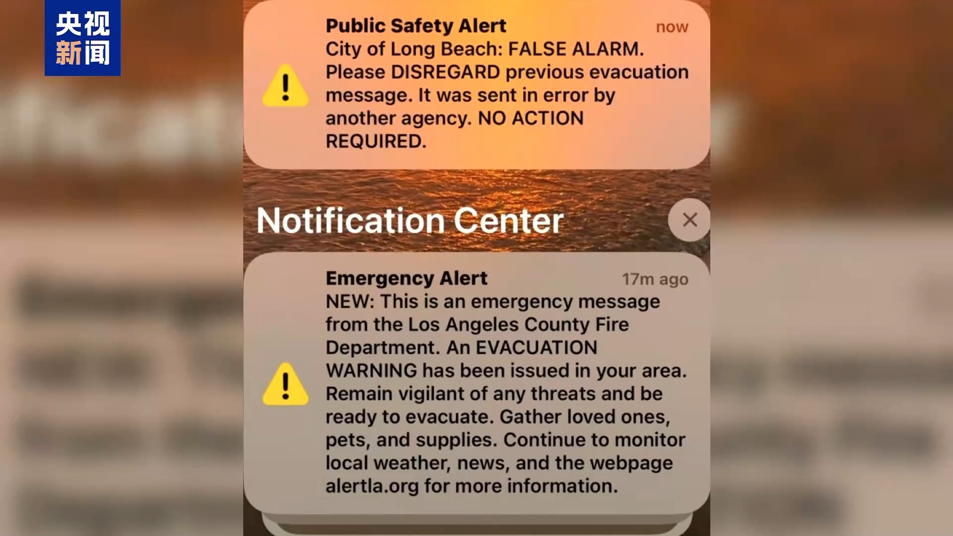 央視記者 劉驍騫:與此同時,根據(jù)我在一線的觀察,人為造成的災(zāi)害正在出現(xiàn)。首先,洛杉磯縣的警報發(fā)布系統(tǒng)嚴(yán)重失靈,造成撤離信息的混亂。一般情況下,如果你所在的區(qū)域處于撤離預(yù)警或者需要立刻撤離的范圍內(nèi),手機(jī)就會收到由洛杉磯縣發(fā)布的政府警報。第一次發(fā)生警報失靈的情況是10日3時左右,我的手機(jī)發(fā)出巨大的警報聲,短信內(nèi)容顯示“我居住的區(qū)域需要立刻撤離”,但是我打開窗,發(fā)現(xiàn)室外并沒有煙味,我立刻登錄了另外幾個災(zāi)難預(yù)警app,也沒有發(fā)現(xiàn)周遭有新的山火出現(xiàn)。幾乎在同一時間,很多生活在洛杉磯不同區(qū)域的網(wǎng)友都表示收到了這條警報。在10日的白天,類似的錯誤警報幾乎每隔幾小時就出現(xiàn)一次,普通居民也從一開始收到警報時的緊張,變成麻木,有的人為了避免過于焦慮,甚至在手機(jī)設(shè)置中關(guān)掉了政府警報通知。