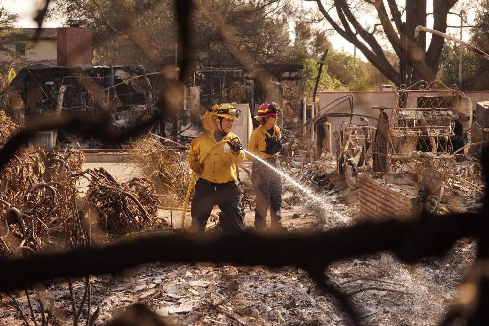 1月10日,在美國(guó)加利福尼亞州洛杉磯縣阿爾塔迪納地區(qū),消防員正在努力撲滅山火過后建筑周圍的熱點(diǎn)區(qū)域。新華社發(fā)(曾慧攝)