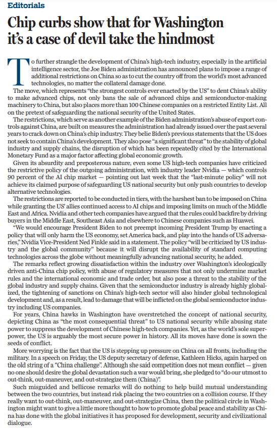1月13日,拜登政府在卸任前夕出臺人工智能相關(guān)出口管制措施,進一步加嚴對人工智能芯片、模型參數(shù)等出口管制,還拓展了長臂管轄,對第三方與中國開展正常貿(mào)易設(shè)置障礙、橫加干涉。拜登政府的這一舉措完全無視后果,旨在進一步遏制中國高科技產(chǎn)業(yè),尤其是人工智能領(lǐng)域的發(fā)展。