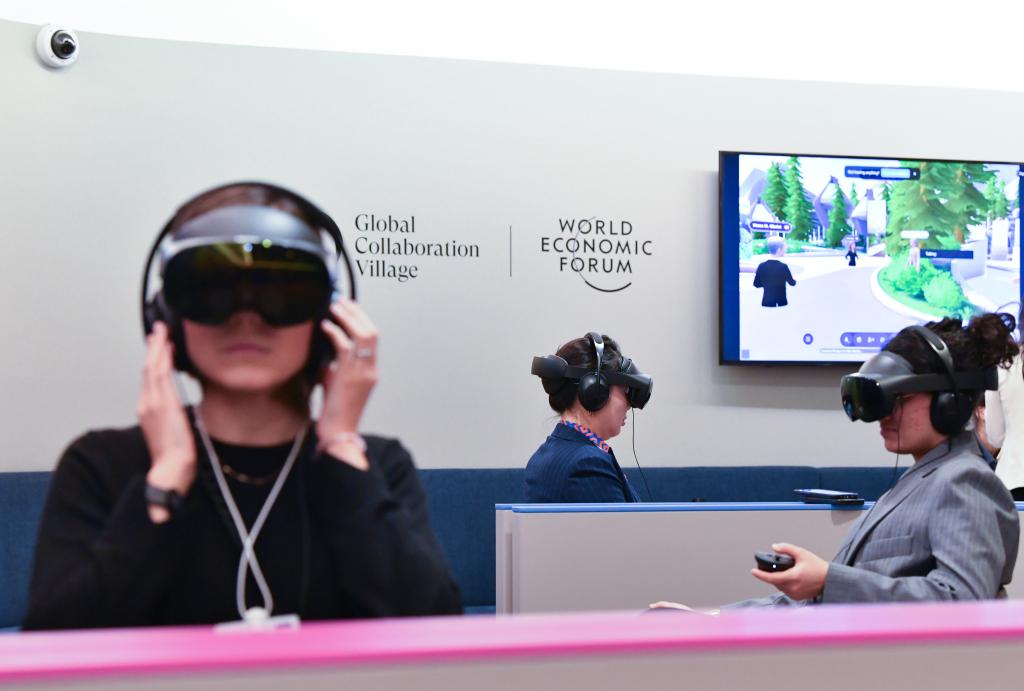 1月23日,在瑞士達沃斯,與會者借助VR設(shè)備沉浸式參加世界經(jīng)濟論壇2025年年會。新華社記者連漪攝