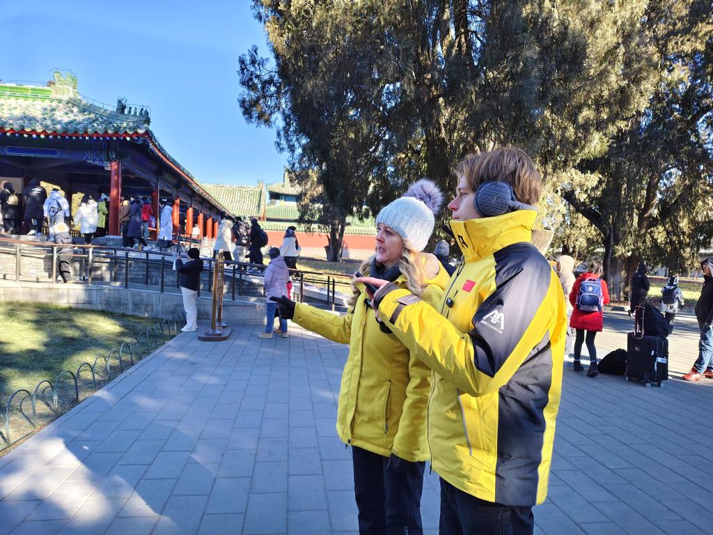 祈年殿、皇穹宇、圜丘……路過(guò)一個(gè)個(gè)景點(diǎn),記者為他們介紹起建筑背后的歷史和“天人合一”理念,母子二人聽(tīng)得津津有味。當(dāng)天北京戶外溫度低至零下8攝氏度,手凍得生疼,但絲毫未影響埃米爾和媽媽拍照記錄的熱情。