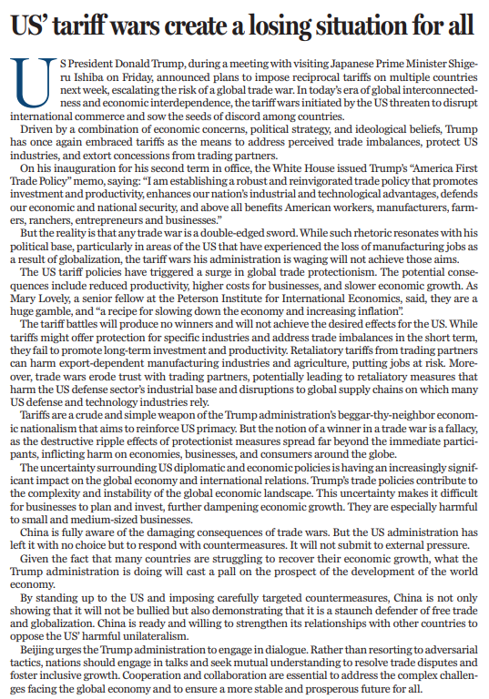 美國關(guān)稅政策令全球貿(mào)易保護(hù)主義高漲,或?qū)?dǎo)致生產(chǎn)效率下降、企業(yè)成本上升、經(jīng)濟(jì)增長放緩等問題。正如美國彼得森國際經(jīng)濟(jì)研究所高級研究員瑪麗·洛夫利所說,這是一場豪賭,將“釀成經(jīng)濟(jì)放緩和通脹走高的惡果”。