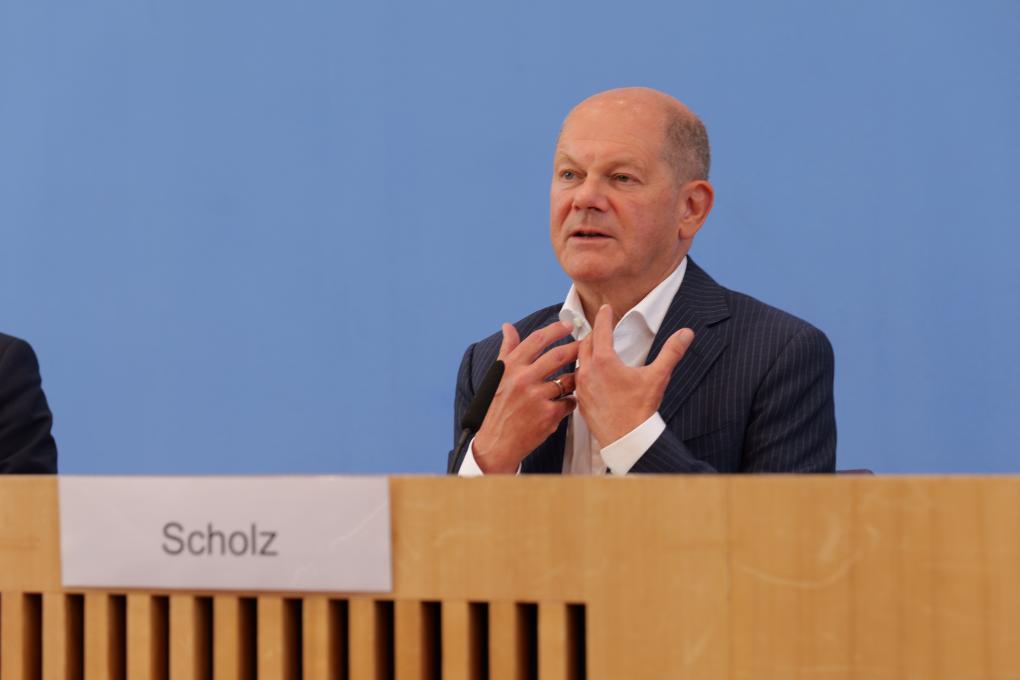 2024年7月24日,德國總理朔爾茨在柏林舉行的新聞發(fā)布會(huì)上講話。新華社記者李函林?jǐn)z