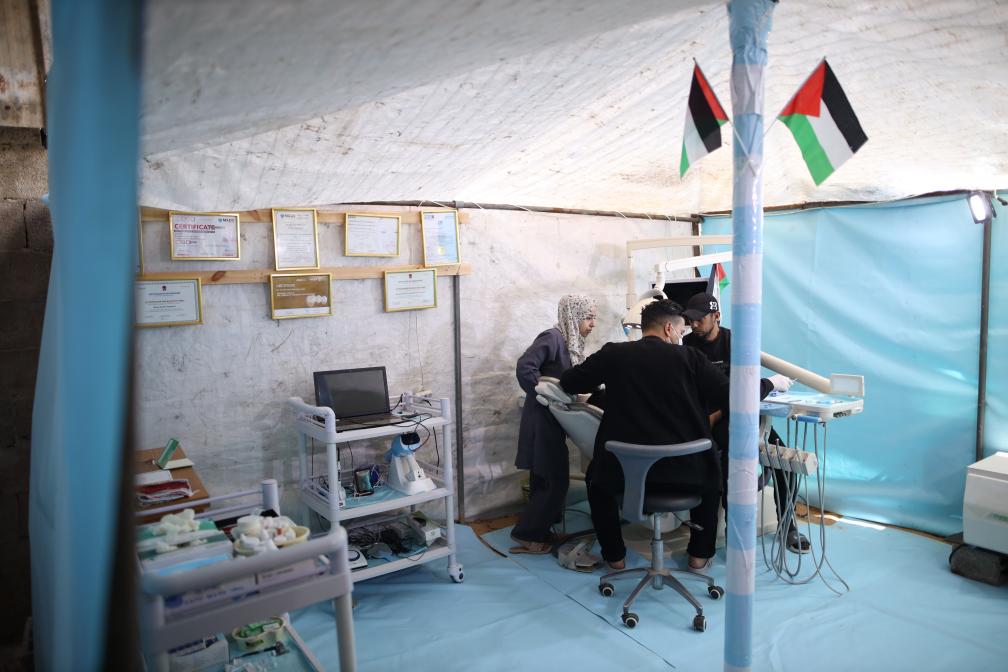 2024年3月30日,在加沙地帶的一家臨時(shí)診所,牙科醫(yī)生為患者看病。新華社發(fā)