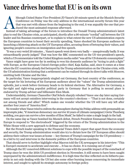 就在萬斯的慕尼黑之行“翻車”之際,法國總統(tǒng)馬克龍在接受《金融時報》采訪時呼吁歐洲加快行動,以新的國防和經(jīng)濟政策應(yīng)對特朗普政府回歸白宮所帶來的“電擊式?jīng)_擊”。但馬克龍可能沒想到,特朗普政府不僅在經(jīng)濟和安全問題上向歐洲施壓,還試圖對歐洲國家如何處理國內(nèi)文化戰(zhàn)爭問題指手畫腳。萬斯的演講表明,美國政府甚至有意介入歐洲國家的內(nèi)政。正如馬克龍所言:“歐洲已經(jīng)別無選擇,歐洲已經(jīng)快無路可走了。”