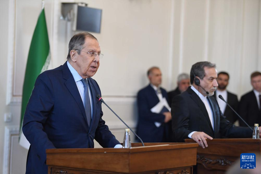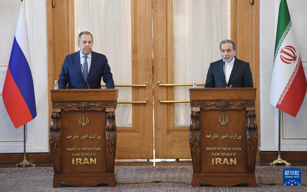 2月25日,在伊朗德黑蘭,伊朗外交部長阿拉格齊(右)與俄羅斯外長拉夫羅夫出席聯(lián)合新聞發(fā)布會(huì)。新華社記者 沙達(dá)提 攝