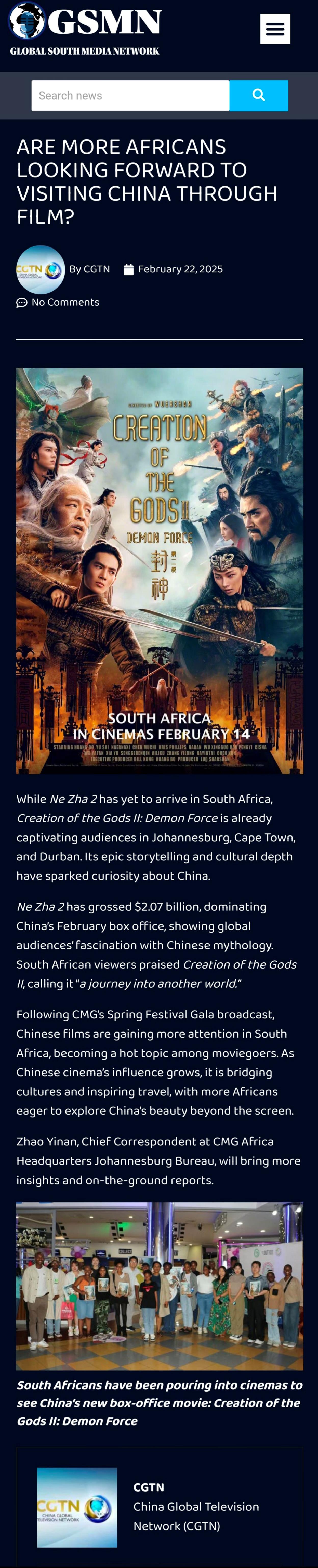 總臺記者在南非約翰內(nèi)斯堡街頭采訪時發(fā)現(xiàn),隨著《哪吒2》《封神第二部:戰(zhàn)火西岐》《唐探1900》等中國電影的熱映,非洲觀眾對中國文化和旅游的興趣日益濃厚。許多年輕觀眾認(rèn)為,中國電影的敘事風(fēng)格、視覺特效和文化內(nèi)涵讓他們對中國歷史、神話以及現(xiàn)代社會充滿好奇。