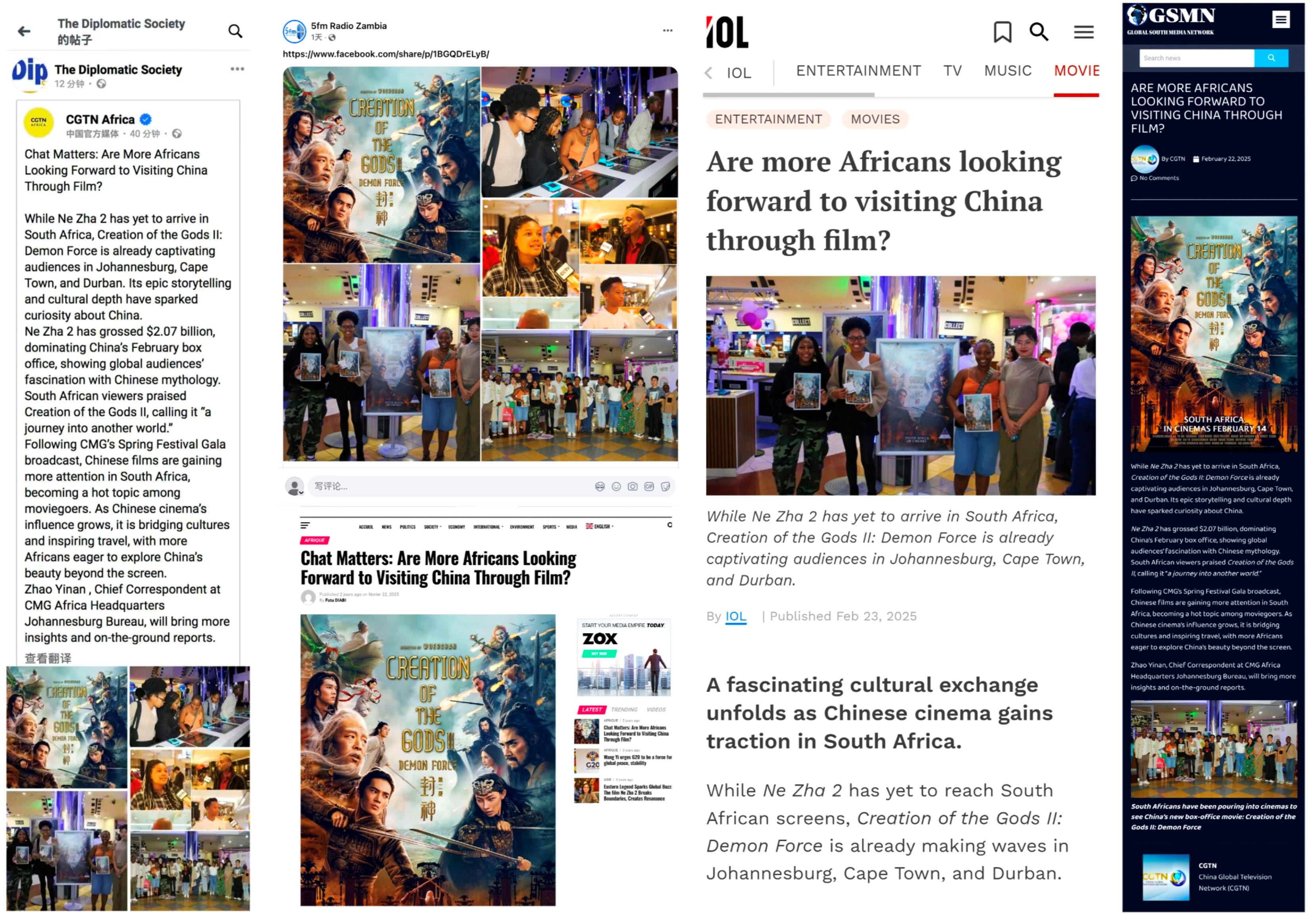 此外,中國春節(jié)檔電影登陸非洲并引發(fā)廣泛影響的相關(guān)報(bào)道被肯尼亞廣播公司、南非獨(dú)立傳媒、南非《外交圈報(bào)》、全球南方新聞網(wǎng)、贊比亞5fm電臺、津巴布韋廣播公司、岡比亞之聲、剛果新聞網(wǎng)等多家媒體轉(zhuǎn)引轉(zhuǎn)載,觸達(dá)超1億受眾。