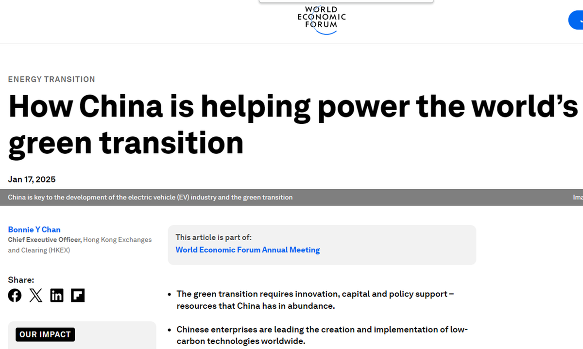 世界經(jīng)濟(jì)論壇網(wǎng)站題為《中國(guó)助力全球綠色轉(zhuǎn)型》的文章強(qiáng)調(diào),中國(guó)在推動(dòng)全球綠色轉(zhuǎn)型過(guò)程中具有關(guān)鍵作用,特別是在電動(dòng)車(chē)、可再生能源及低碳技術(shù)領(lǐng)域。