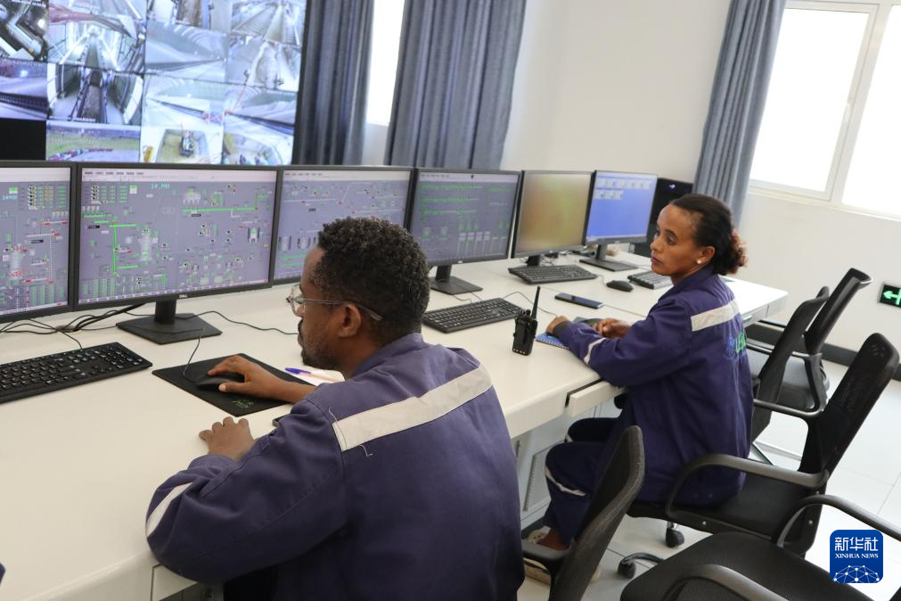 3月5日,當(dāng)?shù)貑T工在埃塞俄比亞萊米國家水泥廠的中控室工作。新華社記者 劉方強(qiáng) 攝
