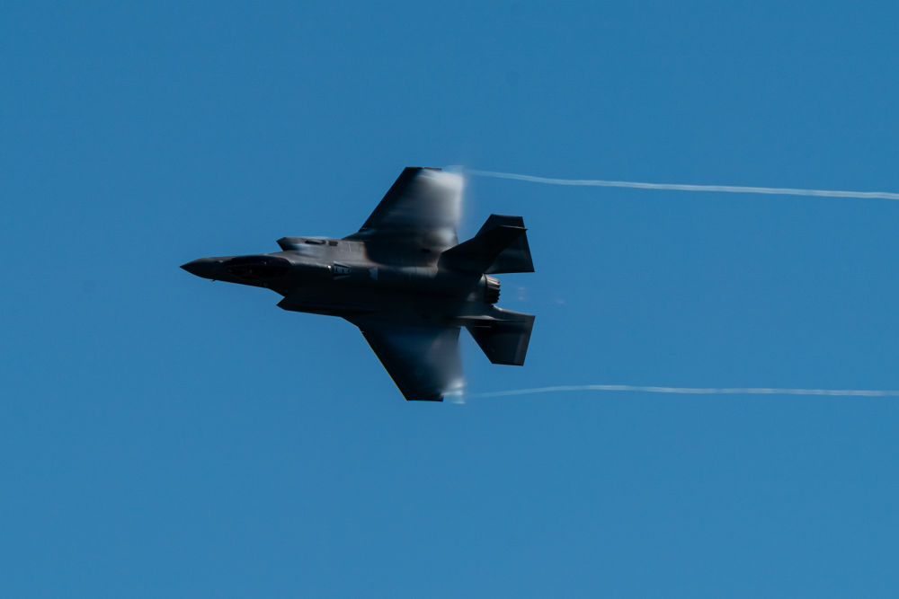 2023年10月14日,在美國休斯敦航展上,F(xiàn)-35閃電飛行表演隊的一架飛機進行表演。新華社發(fā)(陳晨攝)