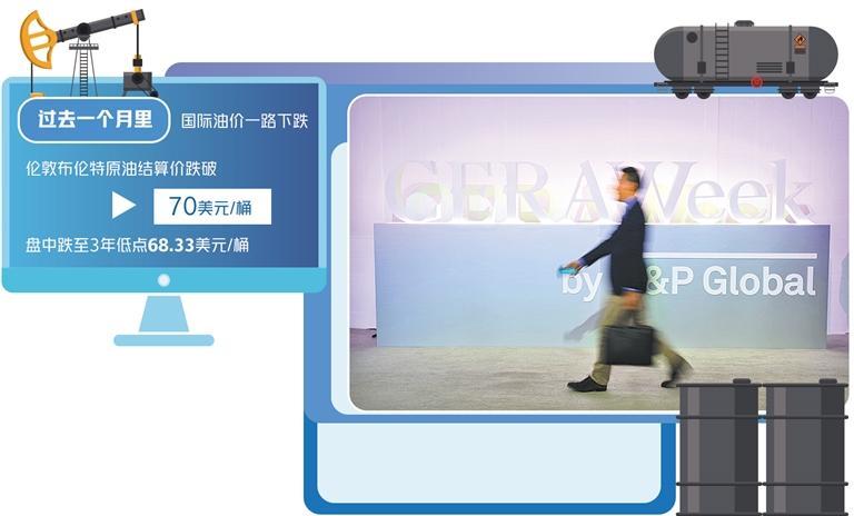 先看最近國際油價的走勢。一方面是油價隨著美國的關稅戰(zhàn)威脅而劇烈波動,并且跌到半年來的最低點。統(tǒng)計數(shù)據表明,在過去一個月里,國際油價一路下跌,倫敦布倫特原油期貨結算價跌破70美元/桶,盤中更是跌至3年低點68.33美元/桶。自特朗普就職以來,國際油價每桶平均價格已經下跌了10美元之多。