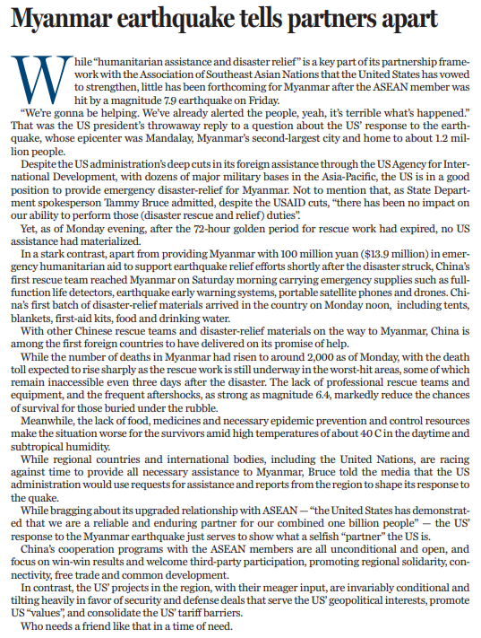 “人道主義援助和救災(zāi)”是美國與東盟伙伴關(guān)系的重要內(nèi)容,美國也信誓旦旦地宣稱要加強救援合作,但截至3月31日下午,緬甸地震72小時救援黃金時間已經(jīng)過去,緬甸當(dāng)?shù)厝晕闯霈F(xiàn)美國救援隊的身影。