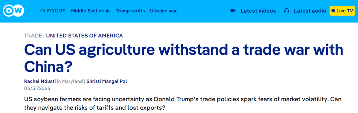 德國之聲3月31日?qǐng)?bào)道稱,特朗普的貿(mào)易政策引發(fā)市場(chǎng)動(dòng)蕩擔(dān)憂,美國大豆種植戶面臨巨大的不確定性。美國大豆出口,特別是對(duì)華出口,多年來一直在下降。特朗普貿(mào)易政策對(duì)農(nóng)民的全面影響可能要等到下一個(gè)收獲季才會(huì)完全顯現(xiàn)。