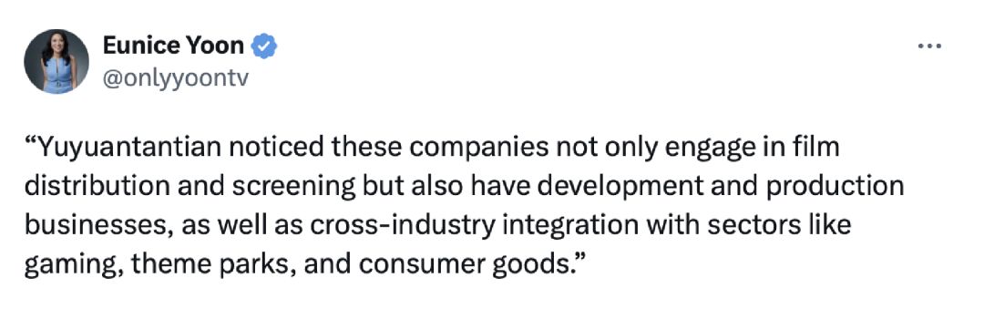 除此之外,譚主此前也就國(guó)家電影局的相關(guān)表態(tài)做過(guò)解讀。當(dāng)時(shí)就說(shuō)了一個(gè)觀點(diǎn),如果中國(guó)消費(fèi)者開(kāi)始在電影領(lǐng)域減少選擇美國(guó)產(chǎn)品,這種趨勢(shì)很可能會(huì)外溢到其他領(lǐng)域,很多國(guó)際媒體做了轉(zhuǎn)引。