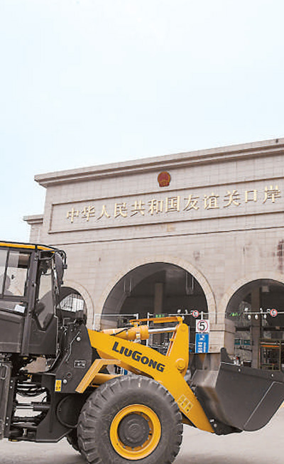 在廣西憑祥友誼關口岸,一批裝載機駛過口岸出口越南。新華社記者 曹祎銘攝