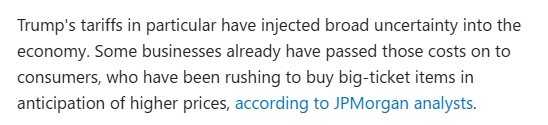 商界領袖們迫切希望美國的政策能有幾周的穩(wěn)定,美國農戶們發(fā)現(xiàn)自己的聯(lián)邦食品補貼合同已經終止,全美各地的非營利組織都在裁員,因為白宮正在削減開支。尤其是特朗普政府的關稅政策給經濟帶來了廣泛的不確定性。摩根大通分析師表示,一些企業(yè)已經將這些成本轉嫁給了消費者,消費者因預期價格上漲而搶購大件商品。
