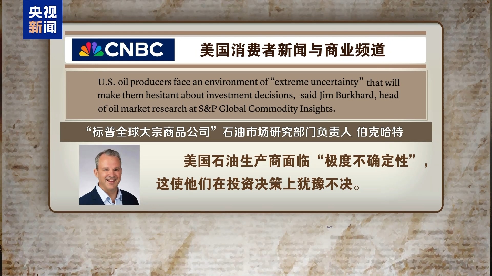 美國消費者新聞與商業(yè)頻道援引“標普全球大宗商品公司”石油市場研究部門負責人伯克哈特的話報道稱,美國石油生產商面臨“極度不確定性”,這使他們在投資決策上猶豫不決。