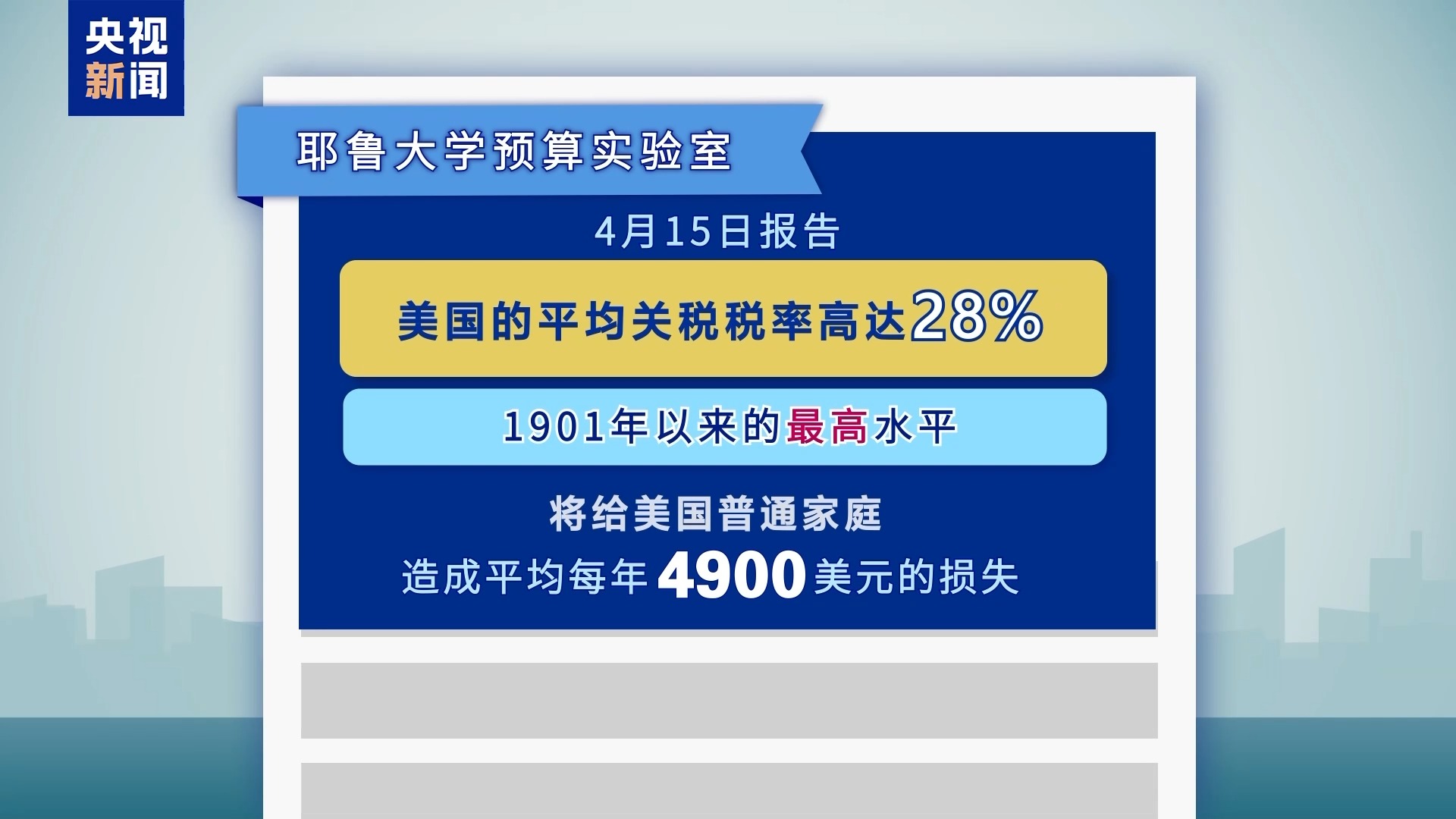 4月15日,在美國與中國、英國達成協(xié)議前,耶魯大學預算實驗室也曾發(fā)布過一份報告。這份報告稱,美國的平均關稅稅率當時高達28%,為1901年以來的最高水平。按照當時的關稅稅率,將給美國普通家庭造成平均每年4900美元的損失。