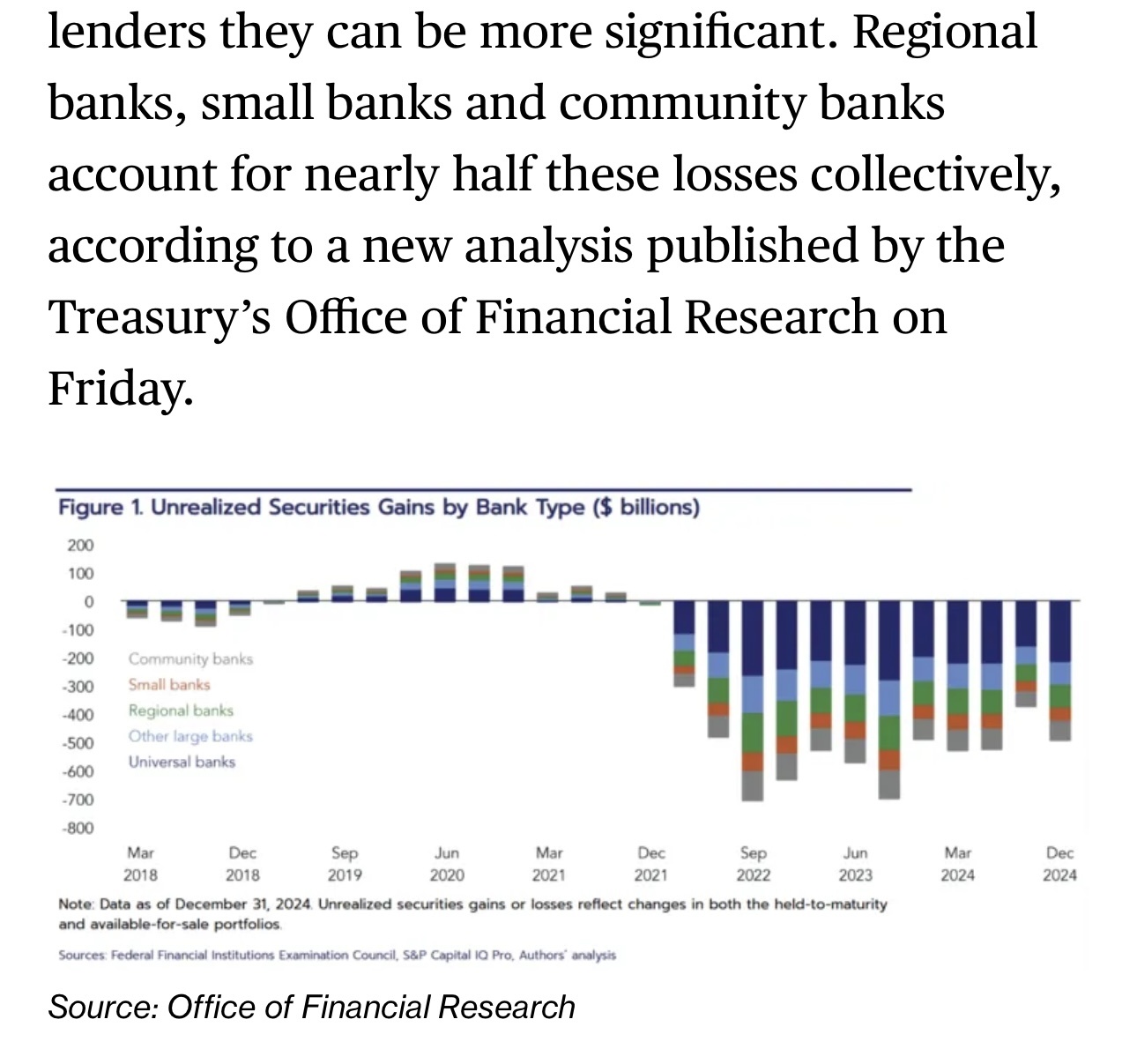 根據(jù)美國聯(lián)邦存款保險公司的最新季度數(shù)據(jù),2024年第四季度,美國銀行債券持有的“未實(shí)現(xiàn)損失”總額進(jìn)一步擴(kuò)大,達(dá)到4820億美元,自9月底以來增加了1180億美元。而根據(jù)美國財政部金融研究辦公室此前發(fā)布的一份報告,地區(qū)性銀行、小型銀行和社區(qū)銀行共同承擔(dān)了這些損失的近一半。